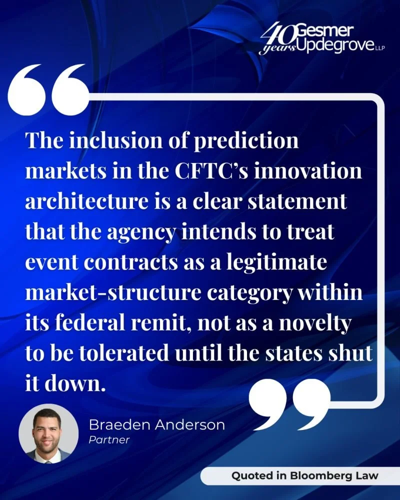 Braeden Anderson, Sr. was quoted in Bloomberg Law’s article, “Crypto, Prediction Market Chiefs Gain Sway as CFTC Advisers,” by Ben Miller, where he discussed the CFTC’s evolving approach to prediction markets.
